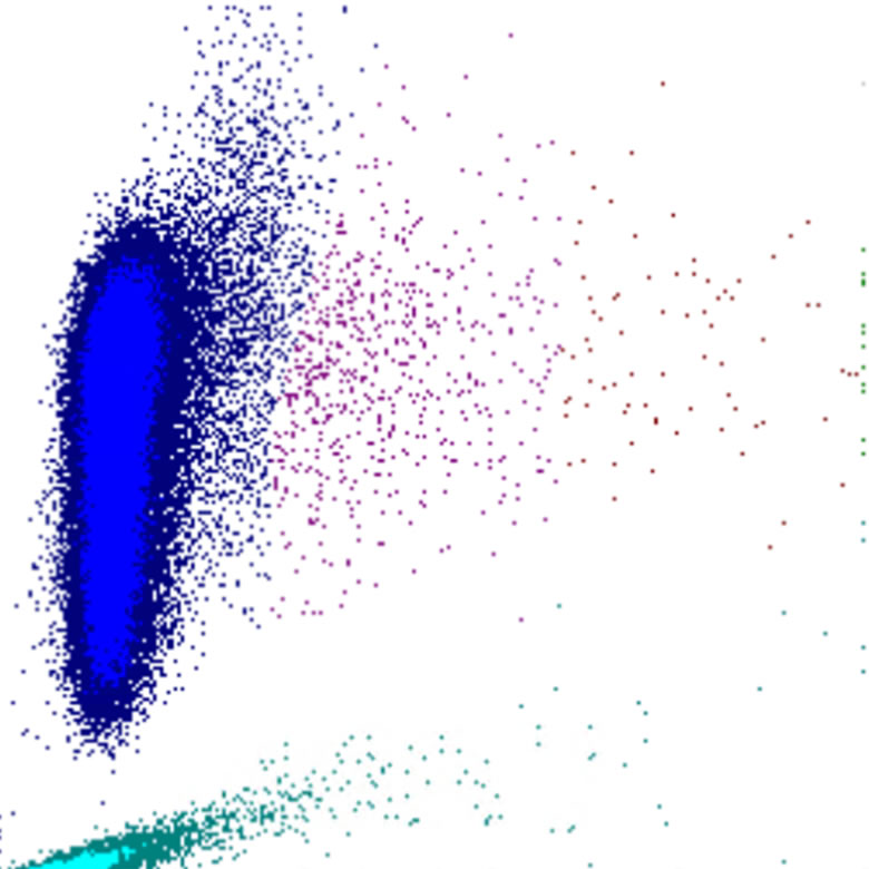 Die Erythrozytenpopulation ist entlang der y-Achse gestreckt und gut abgegrenzt; ein diffuses Muster innerhalb der Erythrozytenpopulation ist nicht vorhanden . Daraus ist ersichtlich, dass die Erythrozyten von unterschiedlicher Größe sind, aber nicht unregelmäßig geformt sind, wie z. B. die Fragmentozyten.