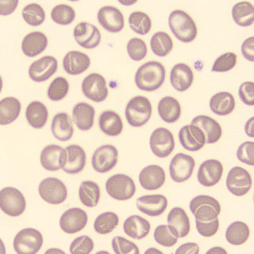 Die Form dieser Population ist ziemlich typisch für die Hämoglobinopathie Südostasiatische Ovalozytose. In diesem Fall sind im Ausstrich Knizozyten zu sehen.