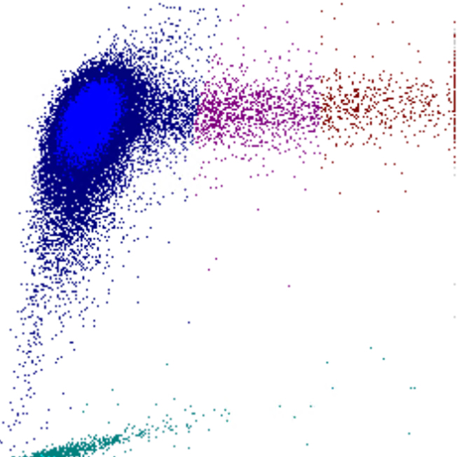 The erythrocyte population shows an additional diffuse horizontal population from the center. Reticulocytes have a higher fluorescence signal than mature erythrocytes because their RNA reacts with the WNR reagent. Mature erythrocytes contain no RNA.