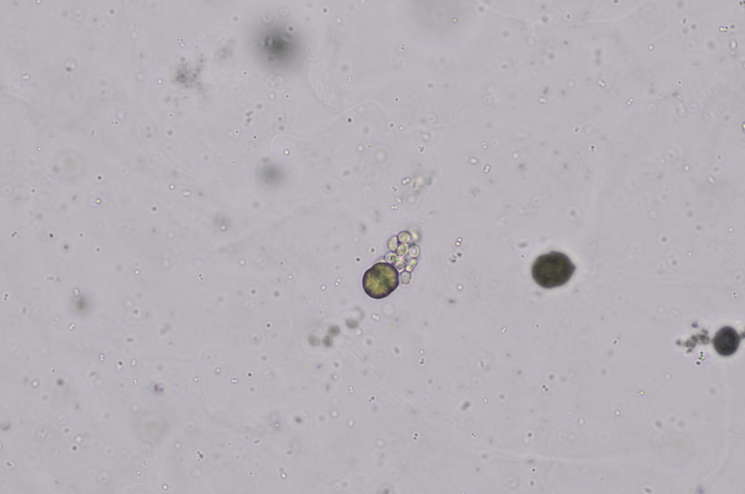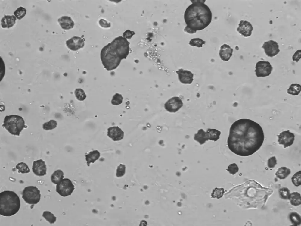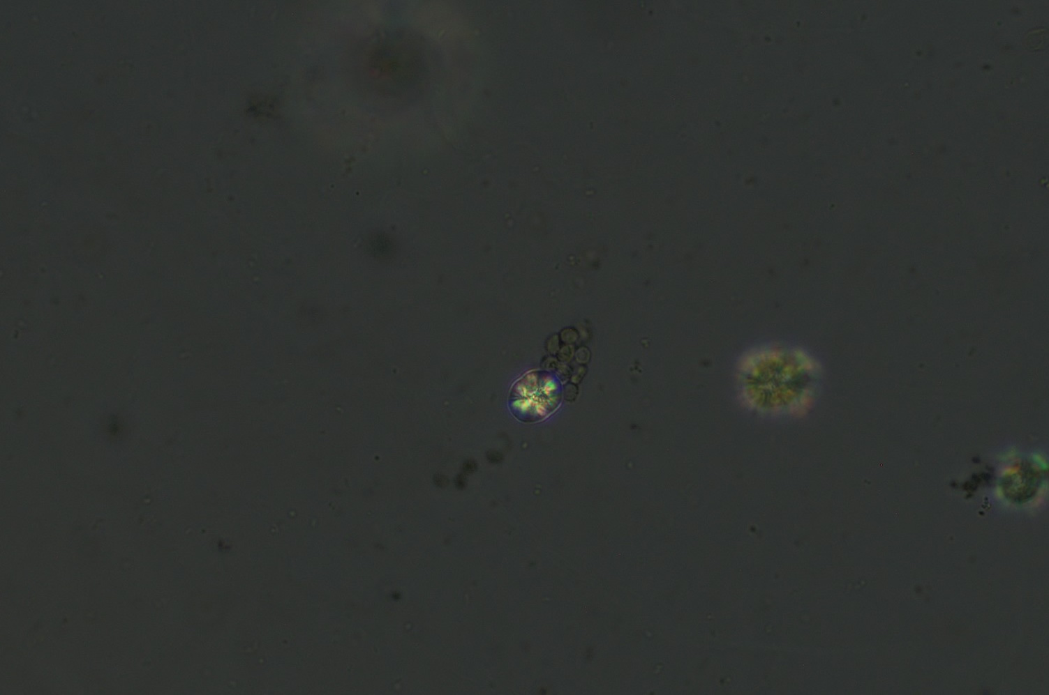 Calcium carbonate crystals are rarely found in human urine, but occur in alkaline environments. They most often appear as small, colorless, dumbbell-shaped structures that lie in clusters and can therefore be easily mistaken for bacteria or fungi. Under polarized light, they are usually not birefringent. Calcium carbonate crystals are more commonly seen in herbivores (such as horses), and their clinical significance in humans is still unclear.