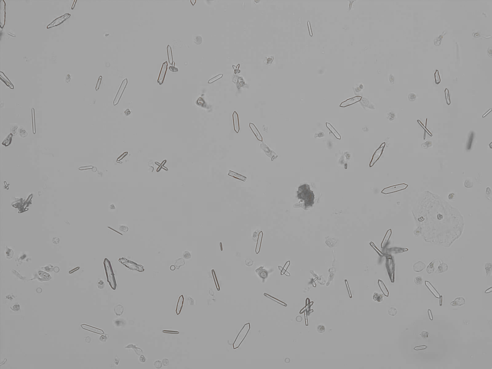 Crystalluria in this situation is characterized by large numbers of birefringent calcium oxalate monohydrate crystals. These often have unusual shapes, such as short prisms, needle shapes, spindle shapes or elongated hexagonal structures. The elongated hexagonal crystals are reminiscent of the slats of a classic fence and are therefore sometimes called "picket fence" crystals.