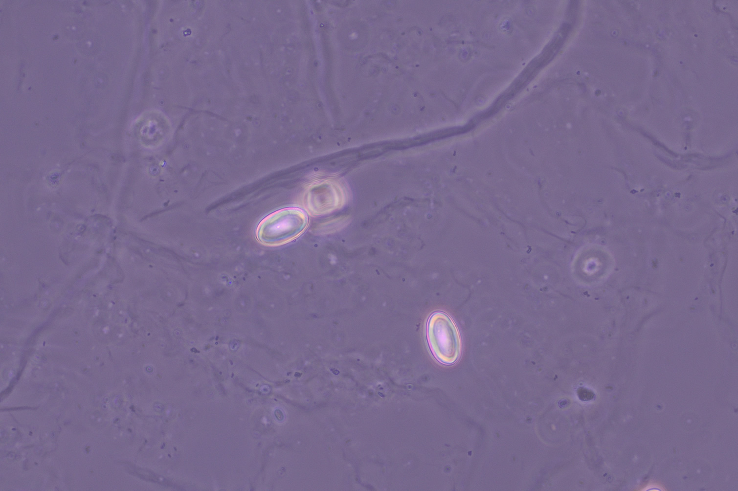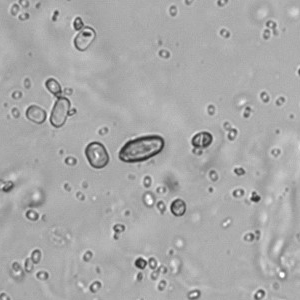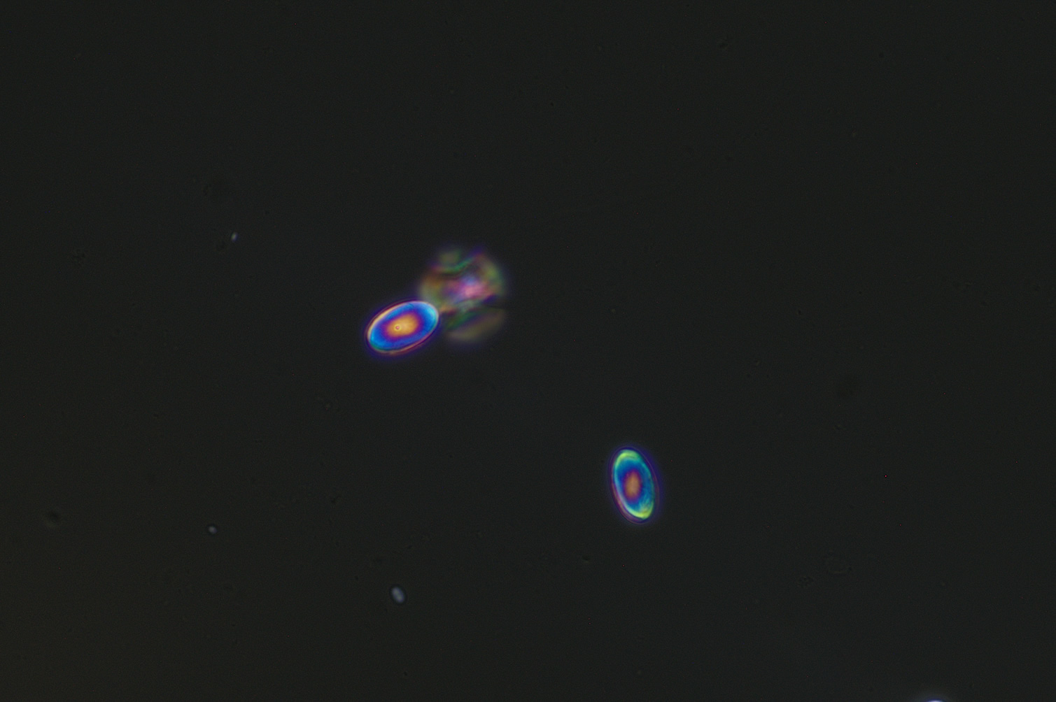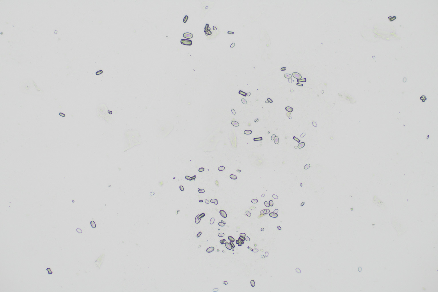 Calcium oxalate monohydrate crystals occur in various forms, such as oval, oval-rectangular, dumbbell, biconcave discs and elongated hexagonal structures. Their size can vary greatly: from very small to nearly field-of-view filling. They are usually colorless and show strong birefringence under polarized light.