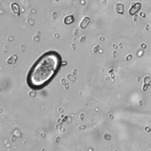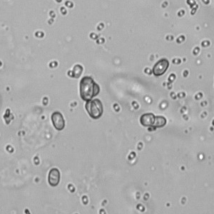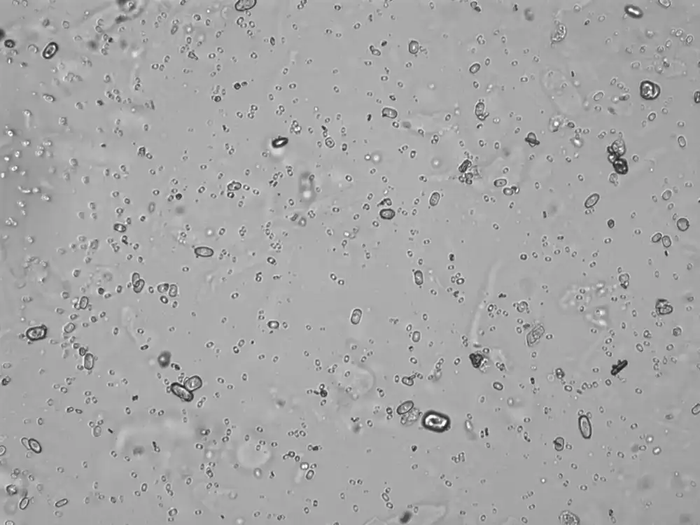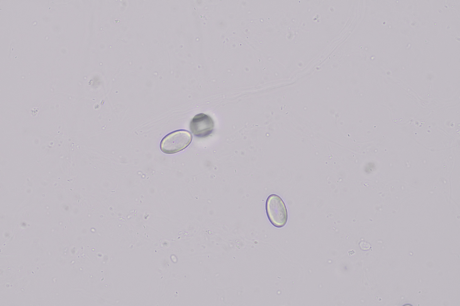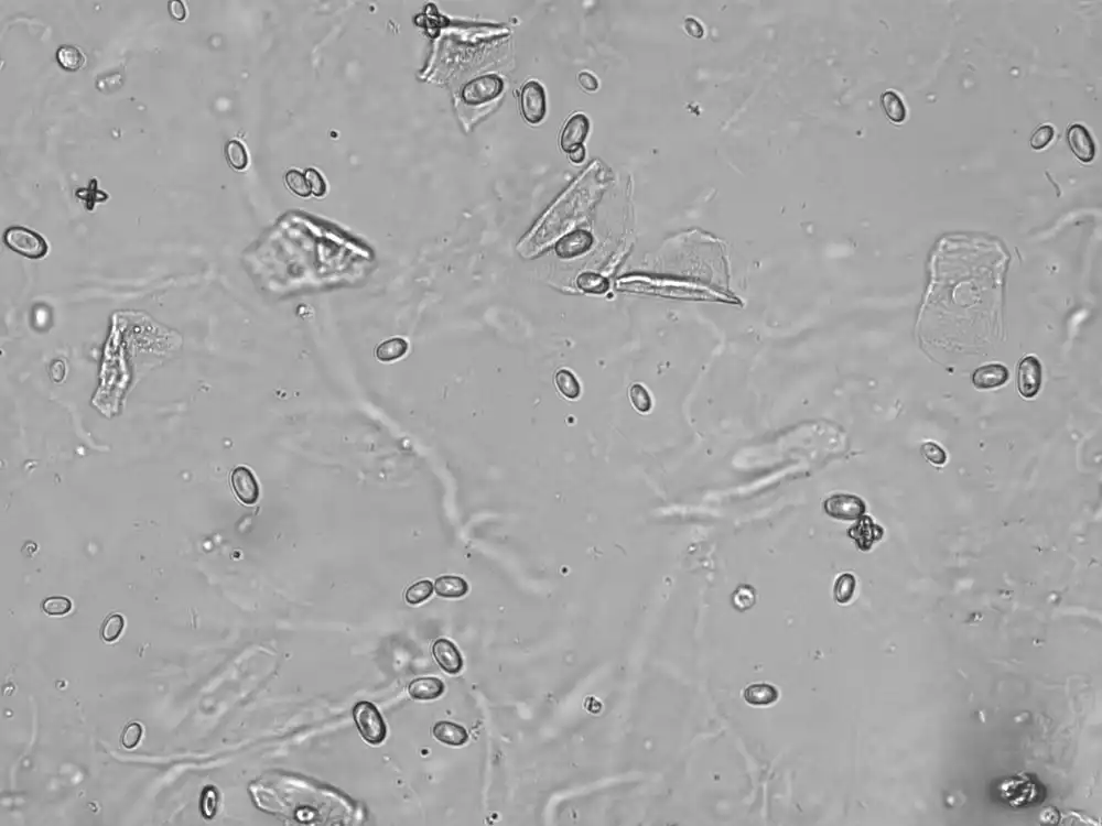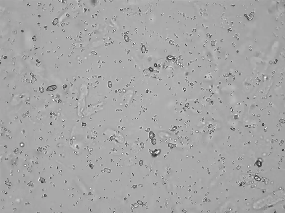 Calcium oxalate monohydrate crystals occur in various forms, such as oval, oval-rectangular, dumbbell, biconcave discs and elongated hexagonal structures. Their size can vary greatly: from very small to nearly field-of-view filling. They are usually colorless and show strong birefringence under polarized light.