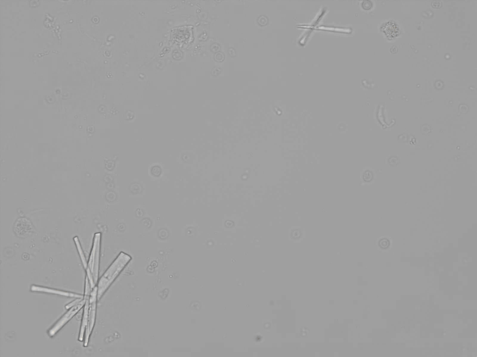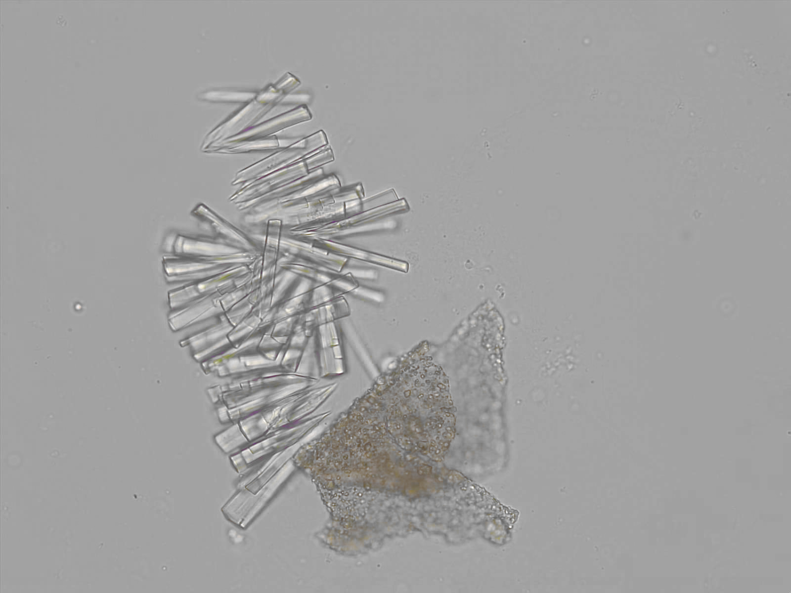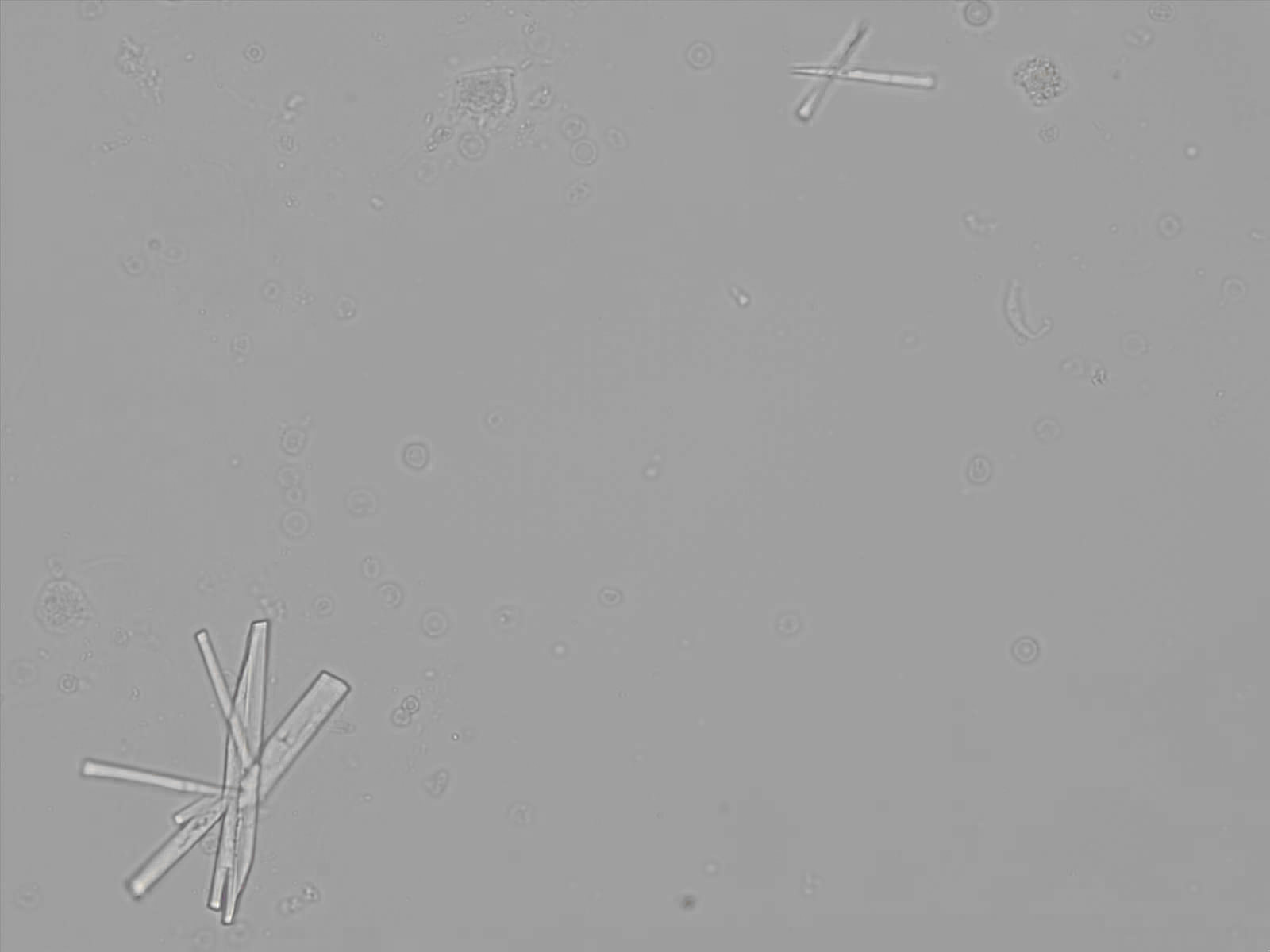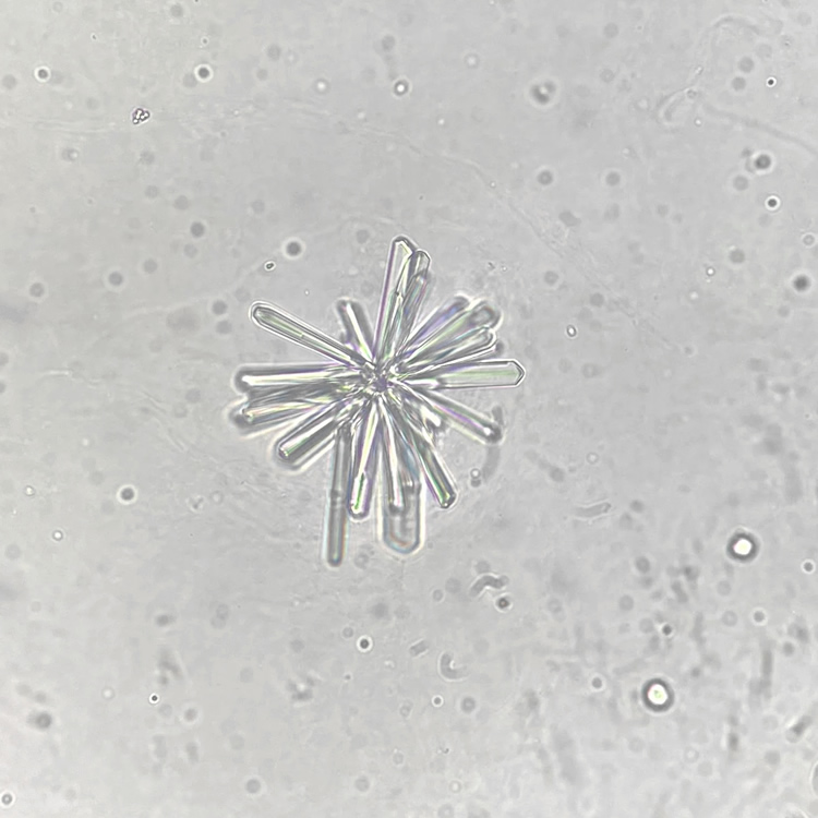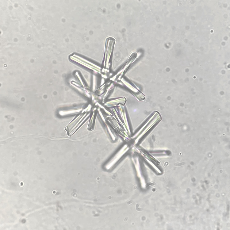 Calcium phosphate crystals frequently occur in normal urine with an alkaline pH (>7.0), but are also seen in people who form kidney stones. They are colorless and show great morphological variation. The crystals may occur as prismatic shapes, needle or wedge-shaped rods with usually blunt ends, and sometimes as star-shaped clusters (rosettes). These shapes are usually strongly birefringent. In addition, large, flat plates with irregular edges and granular structure can also be found. However, these plates are not birefringent.