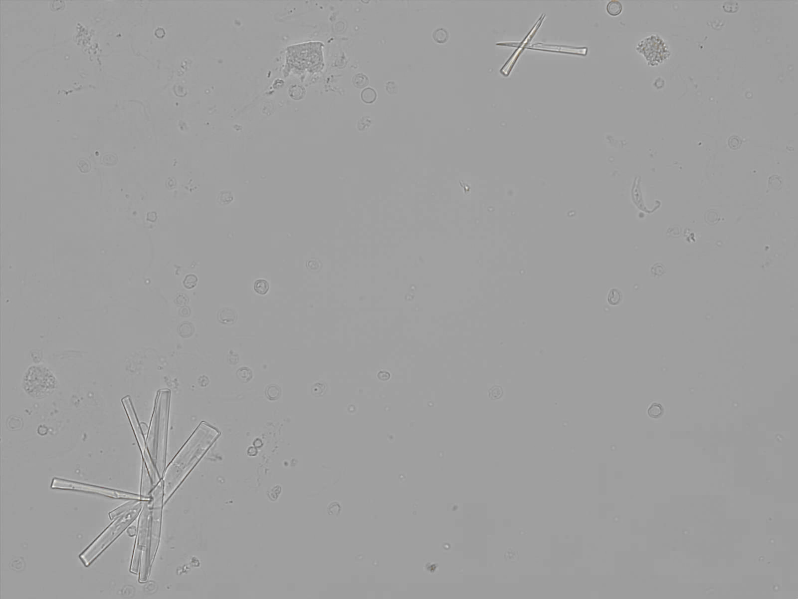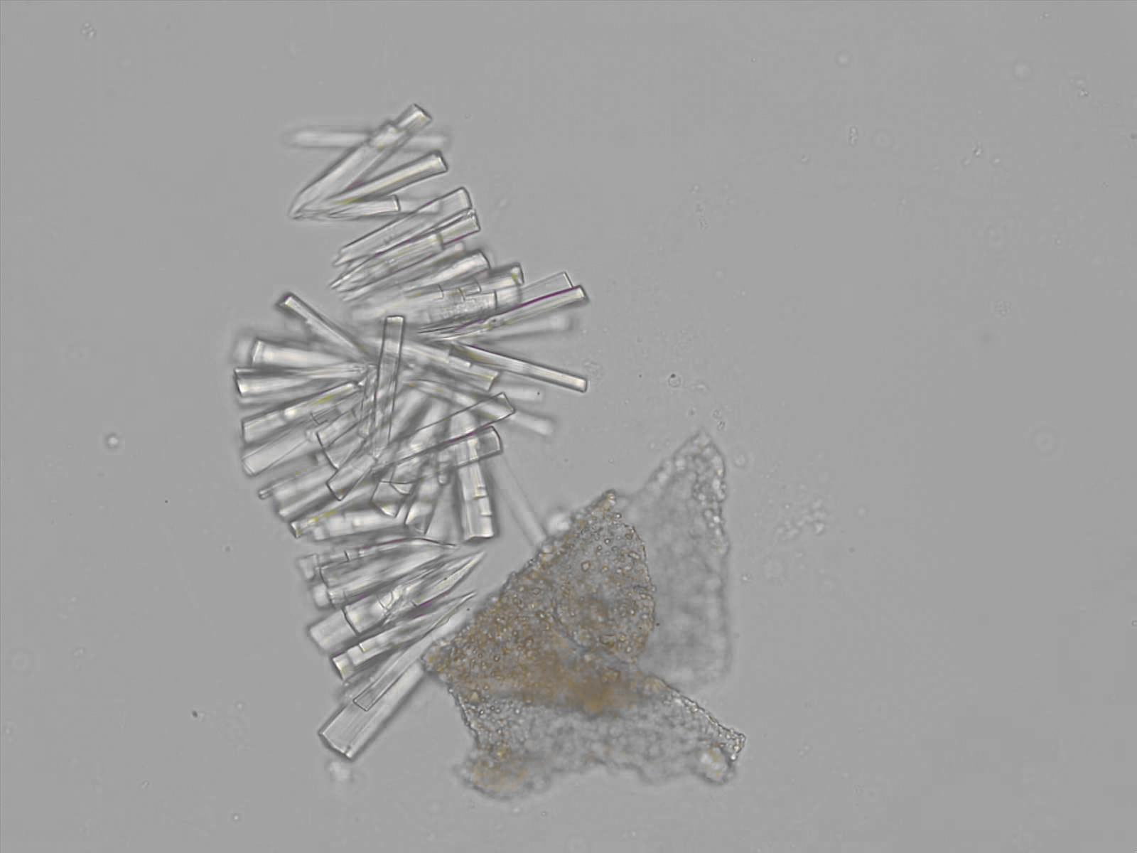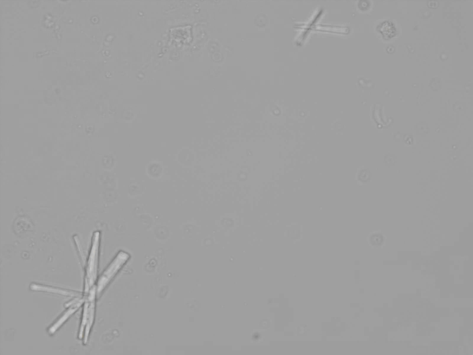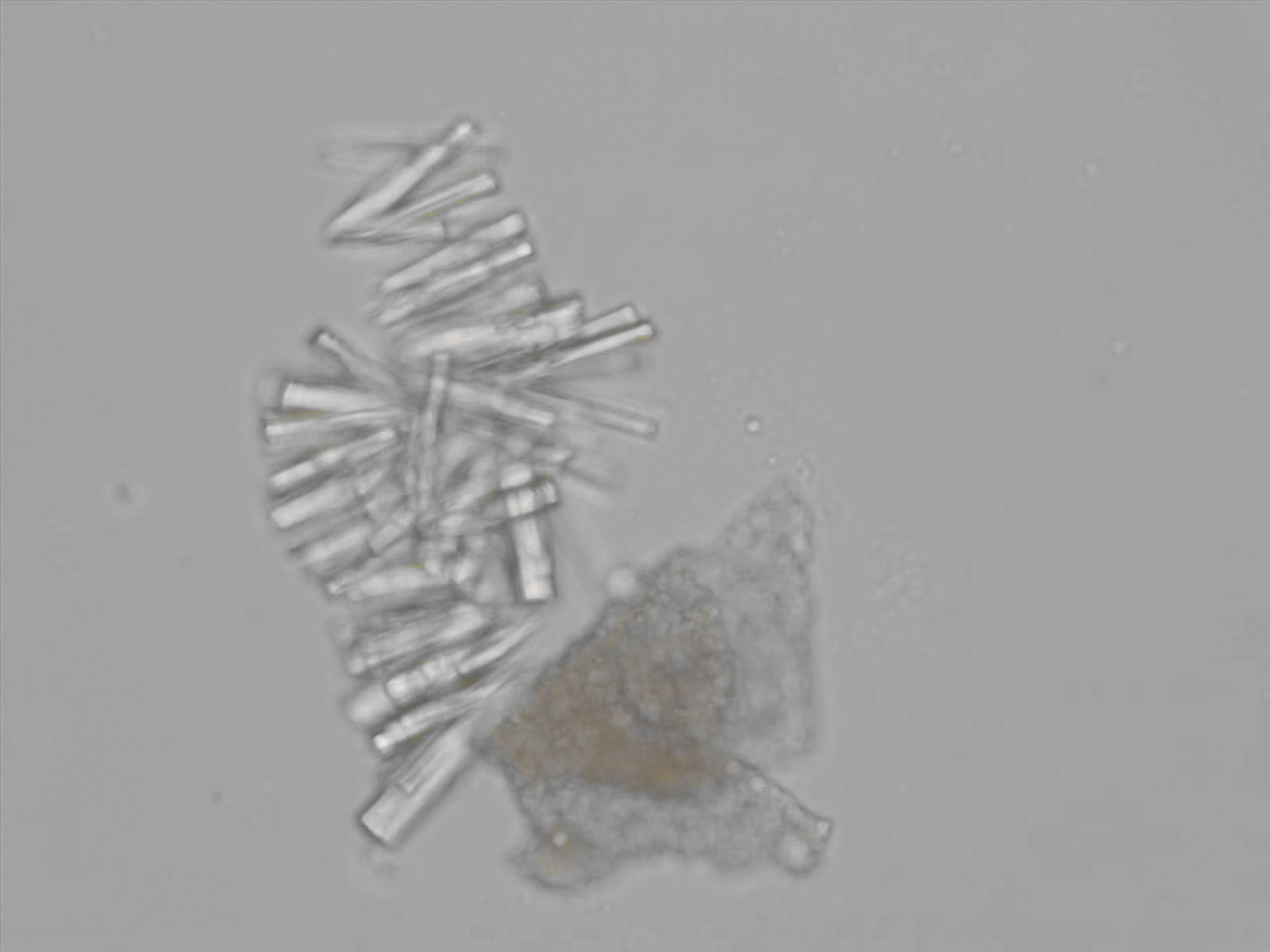 Calcium phosphate crystals frequently occur in normal urine with an alkaline pH (>7.0), but are also seen in people who form kidney stones. They are colorless and show great morphological variation. The crystals may occur as prismatic shapes, needle or wedge-shaped rods with usually blunt ends, and sometimes as star-shaped clusters (rosettes). These shapes are usually strongly birefringent. In addition, large, flat plates with irregular edges and granular structure can also be found. However, these plates are not birefringent.