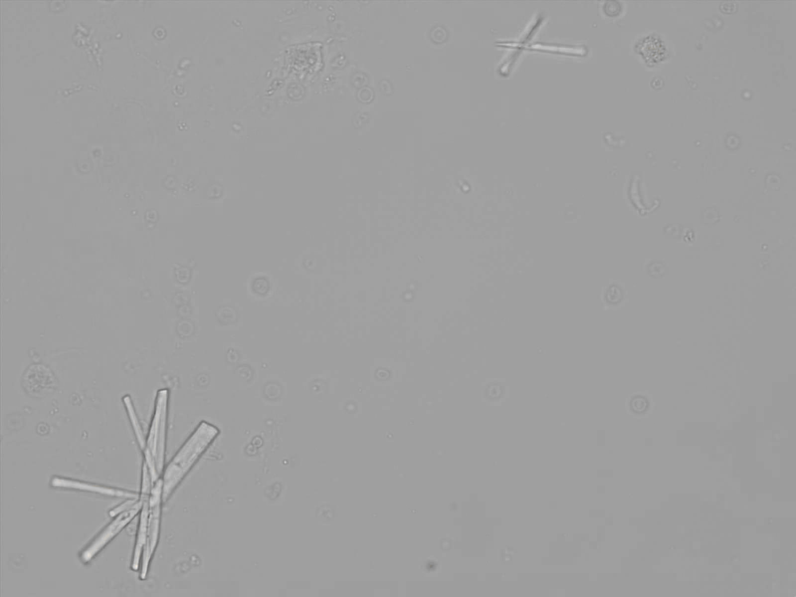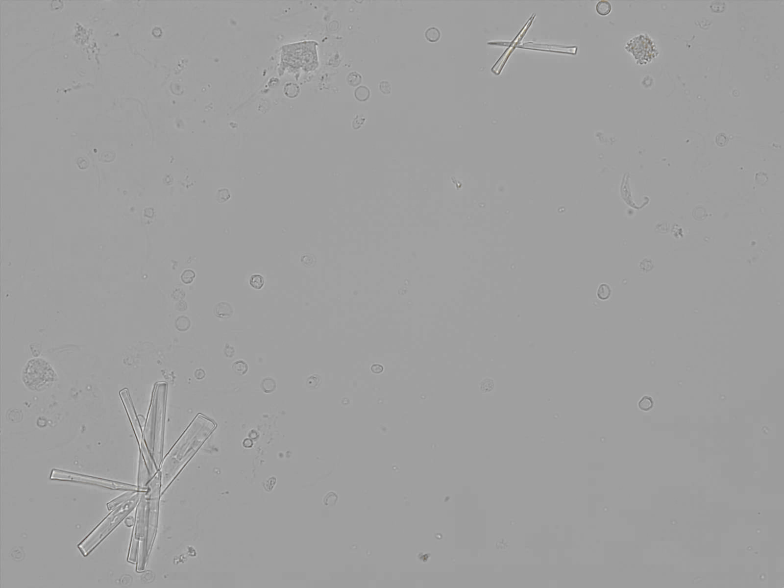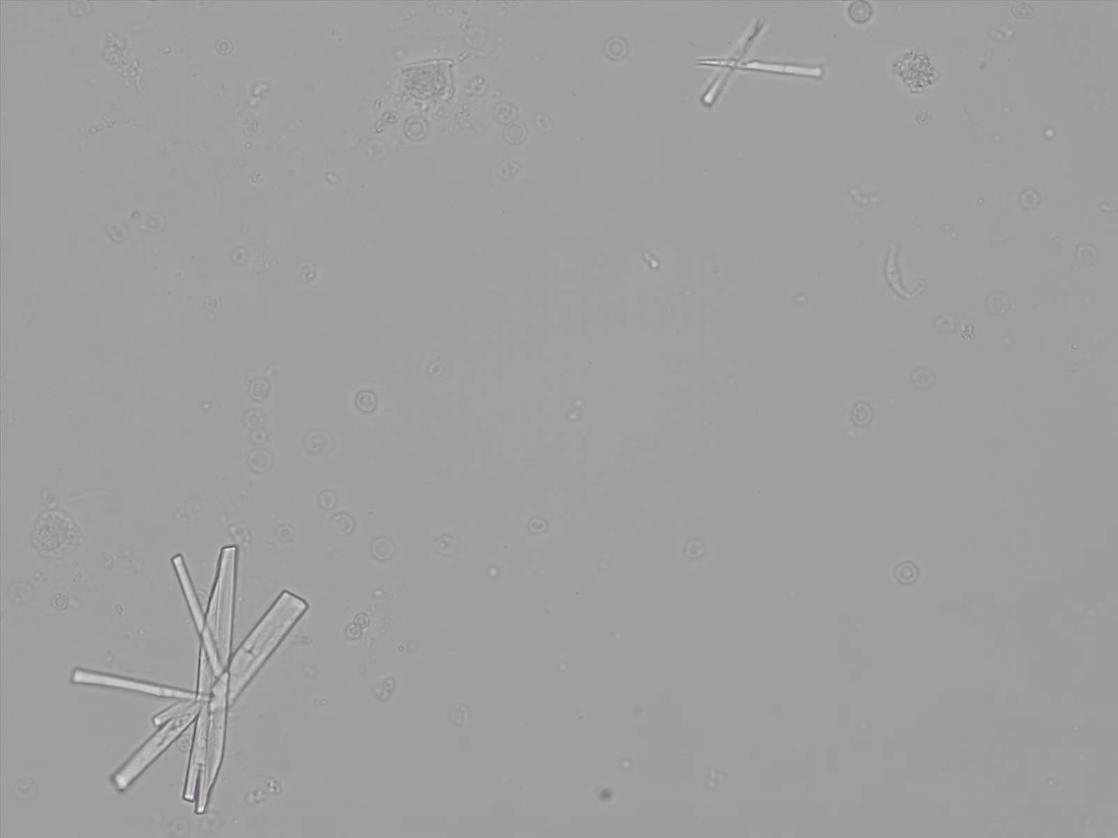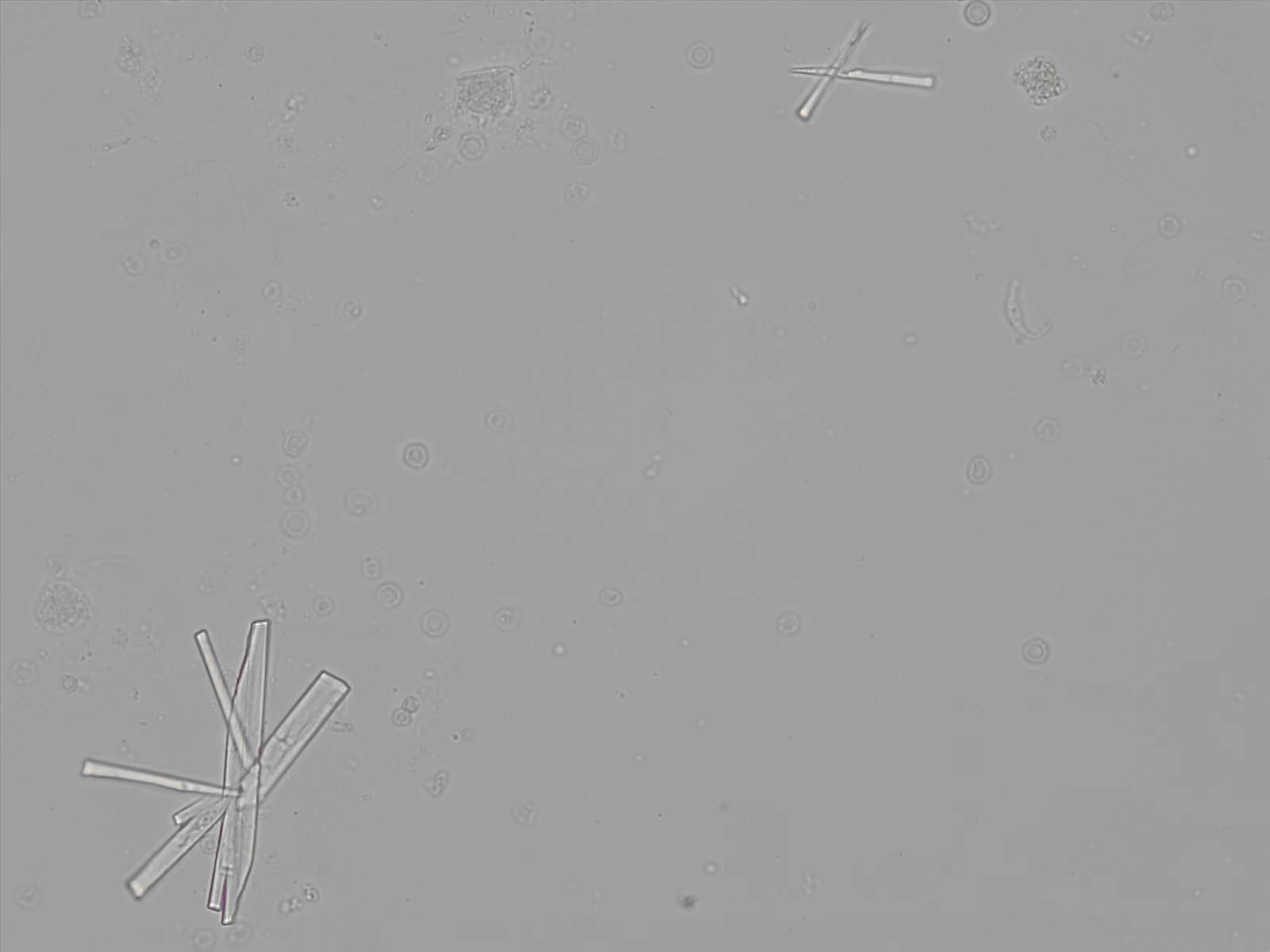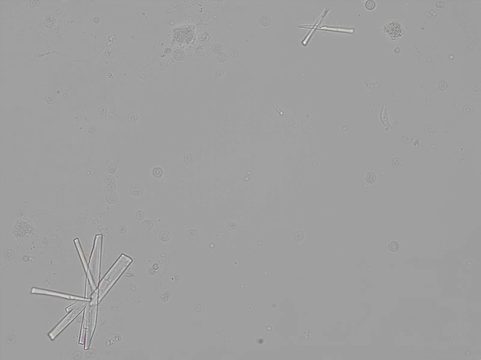 Calcium phosphate crystals frequently occur in normal urine with an alkaline pH (>7.0), but are also seen in people who form kidney stones. They are colorless and show great morphological variation. The crystals may occur as prismatic shapes, needle or wedge-shaped rods with usually blunt ends, and sometimes as star-shaped clusters (rosettes). These shapes are usually strongly birefringent. In addition, large, flat plates with irregular edges and granular structure can also be found. However, these plates are not birefringent.