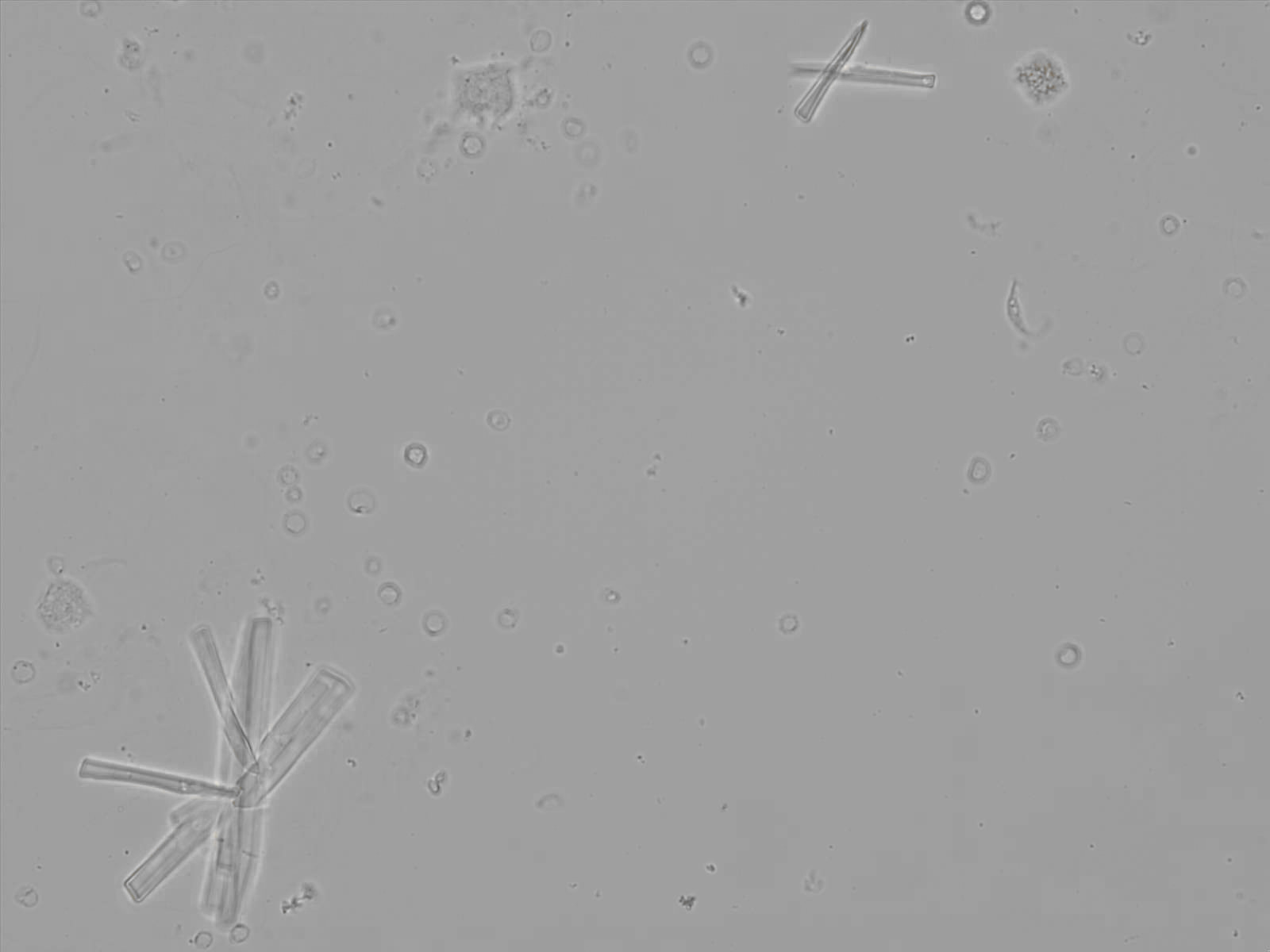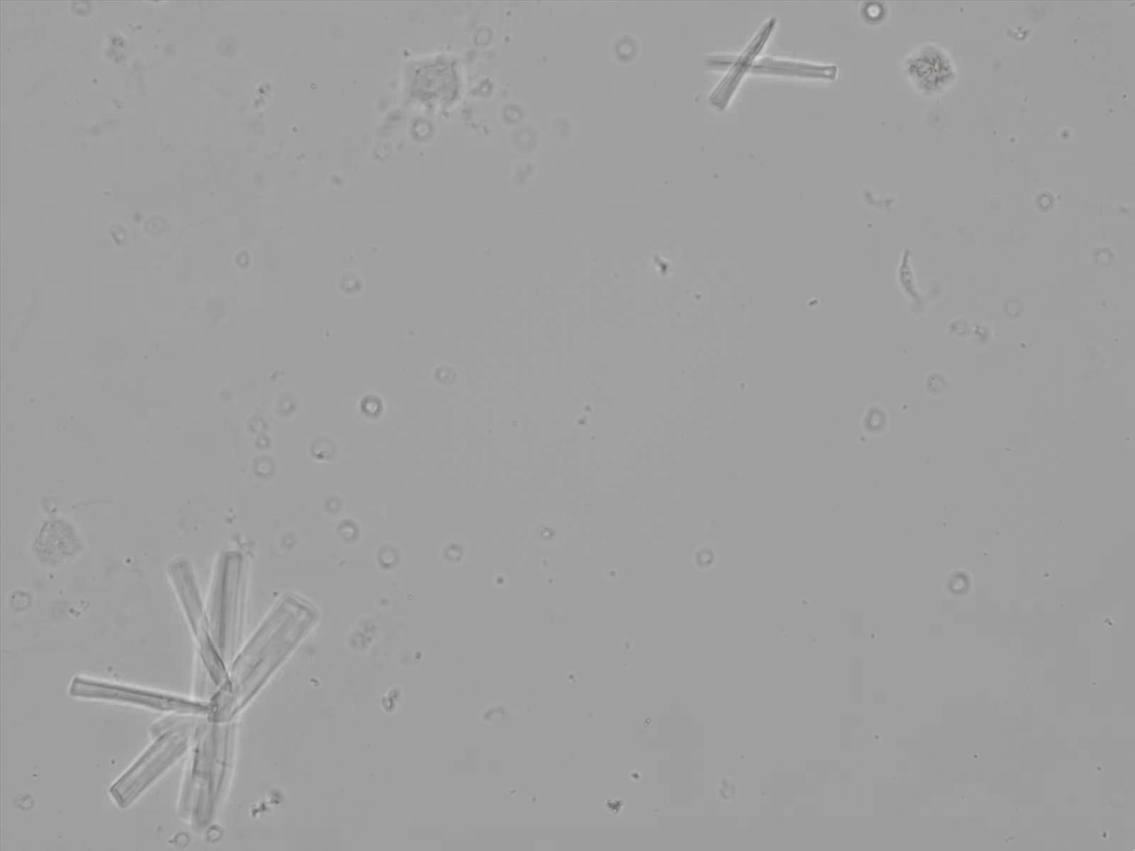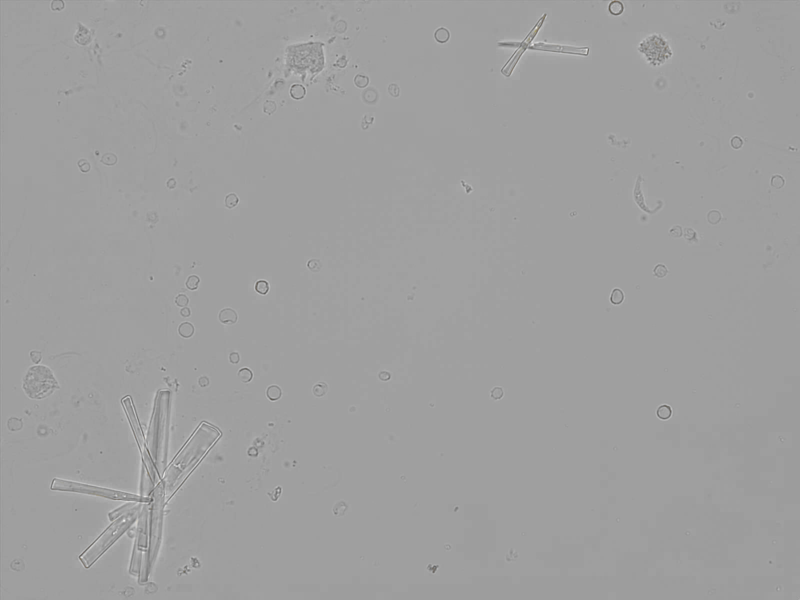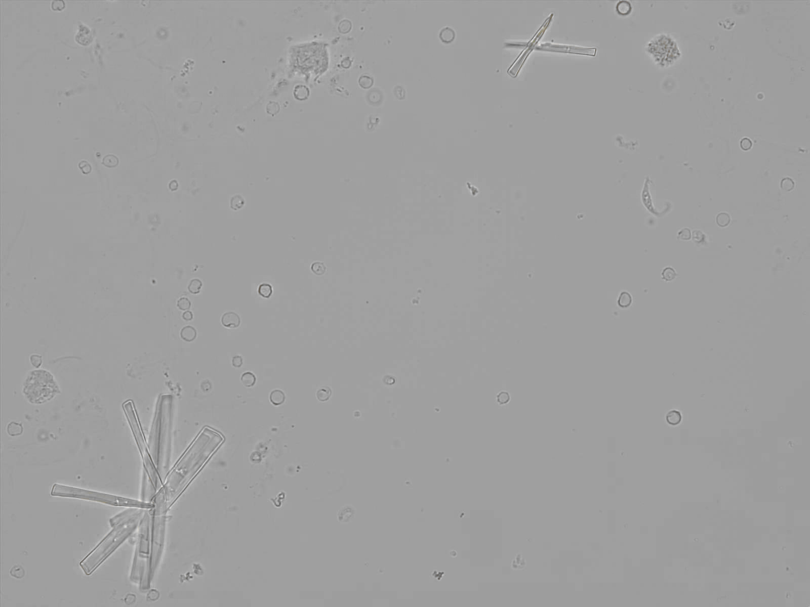 Calcium phosphate crystals frequently occur in normal urine with an alkaline pH (>7.0), but are also seen in people who form kidney stones. They are colorless and show great morphological variation. The crystals may occur as prismatic shapes, needle or wedge-shaped rods with usually blunt ends, and sometimes as star-shaped clusters (rosettes). These shapes are usually strongly birefringent. In addition, large, flat plates with irregular edges and granular structure can also be found. However, these plates are not birefringent.