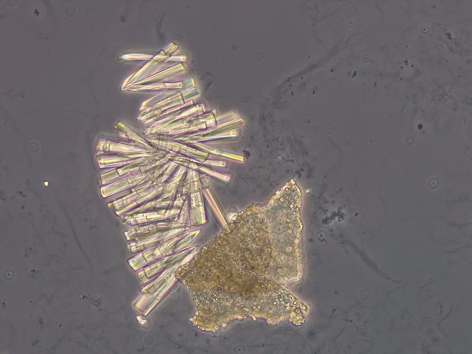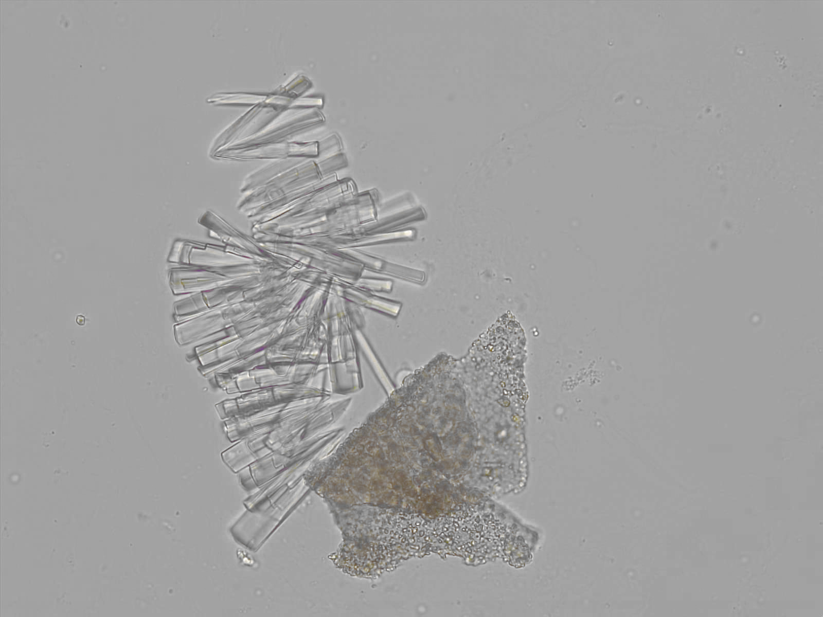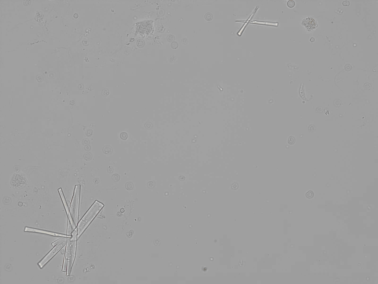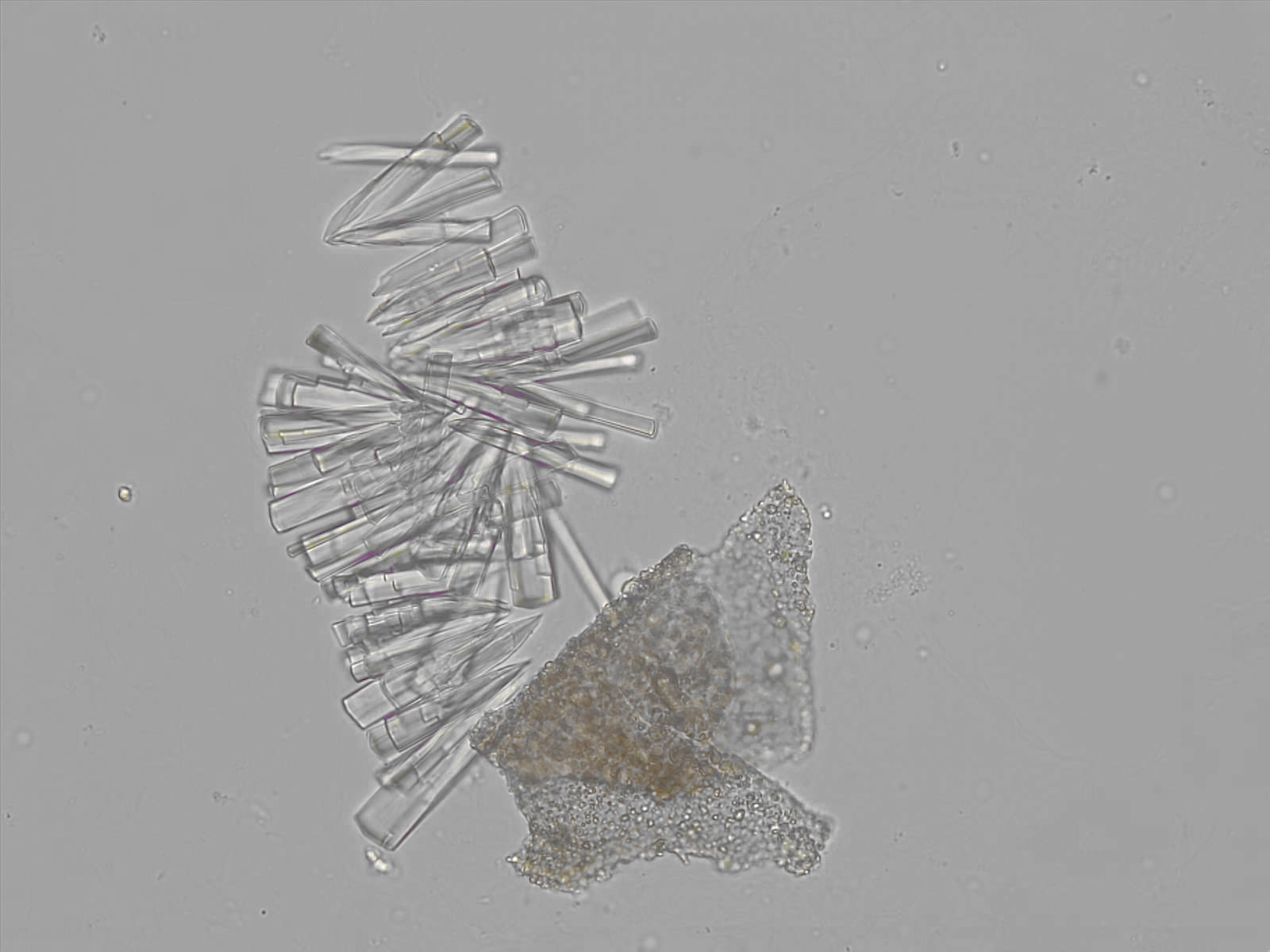 Calcium phosphate crystals frequently occur in normal urine with an alkaline pH (>7.0), but are also seen in people who form kidney stones. They are colorless and show great morphological variation. The crystals may occur as prismatic shapes, needle or wedge-shaped rods with usually blunt ends, and sometimes as star-shaped clusters (rosettes). These shapes are usually strongly birefringent. In addition, large, flat plates with irregular edges and granular structure can also be found. However, these plates are not birefringent.