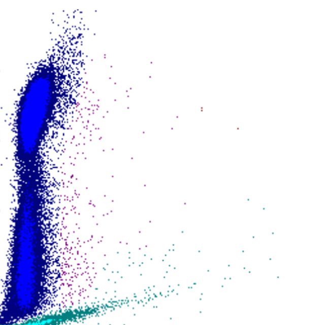 Ce nuage de points montre deux populations. L'une élevée sur l'axe des ordonnées et l'autre basse sur l'axe des ordonnées . Cette image est observée chez les patients dont la numération sanguine est microcytaire (par exemple en raison d'une carence en fer) et qui reçoivent une transfusion sanguine. Les érythrocytes du donneur ont une taille normale. Au microscope, on peut observer un mélange d'érythrocytes petits et vides et d'érythrocytes normaux et bien remplis (dimorphisme).