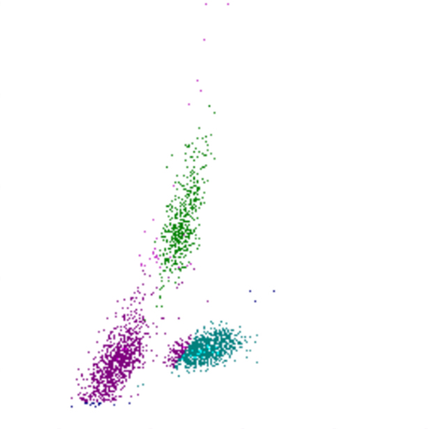 De verdeling van de verschillende leukocyten in het WDF-kanaal is niet sterk afwijkend. De lymfocytenpopulatie ligt iets lager dan normaal en de monocytenpopulatie is minder rechtop georiënteerd . De neutrofiele granulocyten liggen meer naar links, wat wijst op een lagere complexiteit . In het RET-kanaal zien we een populatie erytrocyten met een afgenomen grootte en daarnaast is er sprake van reticulocytose .